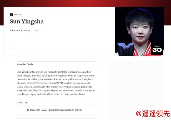此前,王楚钦曾入选过2023年度福布斯中国30 Under 30榜,而孙颖莎更是早在2020年就入选过福布斯中国30 Under 30榜。接下来,他俩将在2024巴黎奥运会上都是身兼三项,并携手出战混双。