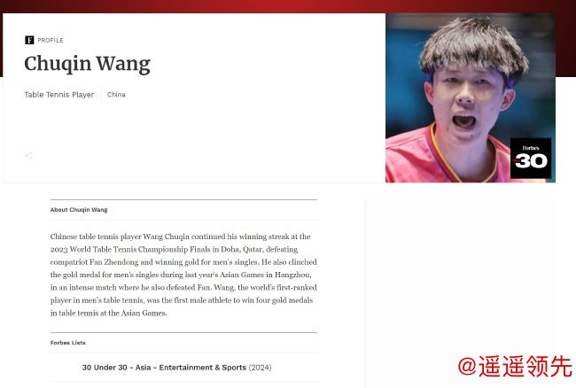 而对于王楚钦,问鼎娱乐下载官网福布斯官网给出的入选理由是:中国乒乓球选手王楚钦在卡塔尔多哈举行的2023男子总决赛上,延续连胜步伐,击败队友樊振东夺得男单金牌。在去年的杭州亚运会上,他还在一场激烈的比赛中,同样击败樊振东夺得男单金牌。目前排名男单世界第一的王楚钦,也是首位在亚运会上独揽4枚乒乓球金牌的男选手。