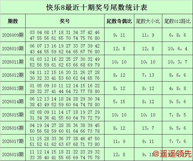 福彩快乐8第2026018期开奖回顾:11 12 14 15 18 21 22 23 29 32 33 35 40 41 55 65 69 74 75 78,其中奖号尾数012路比为5:5:10,尾数大小比为9:11,奇偶比为12:8。