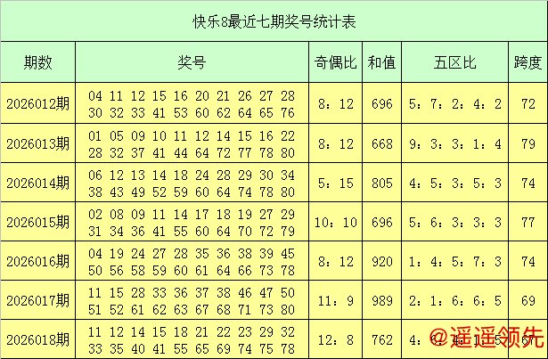 福彩快乐8第2026018期开出奖号:11 12 14 15 18 21 22 23 29 32 33 35 40 41 55 65 69 74 75 78,其中奖号奇偶比为12:8,和值为762,跨度67,五区比为4:6:4:1:5。